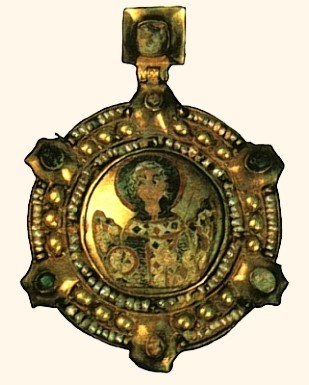 Rien d'étonnant à ce que Vassilissa, partant pour une initiation typiquement païenne, se signe. La double foi survit pratiquement jusqu'au XX s. Et dès le début du XI s. la Russie connaît ce qu'on appelle le néo-paganisme. barma : ce médaillon en or du XII s. illustre bien la double foi. Alors qu'il représente la Mère de Dieu on reconnaît l'attitude d'orante (bras levés) typique de Makoch, la roue de Perun avec les six " rayons " solaires, la répétition du motif solaire en "gigogne" et sur le vêtement le losange, symbole du champ fertile. |