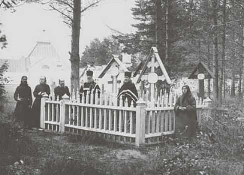 Les cimetières russes, surtout à la campagne, se trouvent souvent dans des bois. Même dans les villes, les cimetières ressemblent souvent à de parcs. Les tombes sont entourées de clôtures ouvragées et on pousse un petit portail lors des cérémonies comémoratives, lorsqu'on vient en famille boire et manger sur la tombe d'un parent. Souvent, on trouve des bancs à l'intérieur de l'enclos dont la taille est très variable; la place, généralement, ne manque pas. |