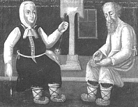 On pourrait s'étonner qu'une si belle jeune fille porte des lapti, ces chaussons en écorce de bouleau tressée. Mais les laptis étaient très commodes à la campagne. Légers et souples ils s'adaptaient à la forme du pied dès qu'on les mouillait. Ils s'usaient très vite mais leur fabrication était très simple. Pour une chose difficile on disait : "c'est autrement plus compliqué que de tresser des lapti". |