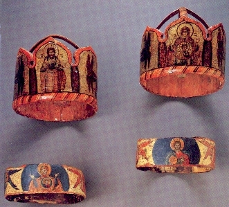 Les couronnes portées symboliquement lors de la céremonie du mariage orthodoxe faisaient des fancés le roi et la reine de la fête. C'est ainsi qu'on les appelait tout au long des festivités : visites des familles, échanges de cadeaux, jeux des présages (primiety), repas ritualisés, etc. |