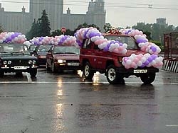 On compense la pauvreté de la cérémonie au Zags par de nouvelles coutumes laïques. On attache une poupée-baigneur sur le capot de la voiture des mariés, on décore tout ce qui est possible de décorer avec des ballons et on va se faire photographier aux endroits patriotiques de sa ville. A Moscou, c'est la tombe du soldat inconnu dans le parc près du Kremlin et les Monts Vorobiovy (Monts Lénine) avec l'Université à l'arrière plan. |