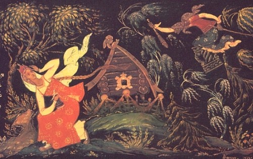 Tout à coup se fit un grand bruit dans la forêt. Les branches craquaient, les feuilles mortes crissaient, Baba-Iaga sortit de la forêt. Elle avançait dans son mortier, s'éperonnant de son pilon, effaçant les traces avec son balai.